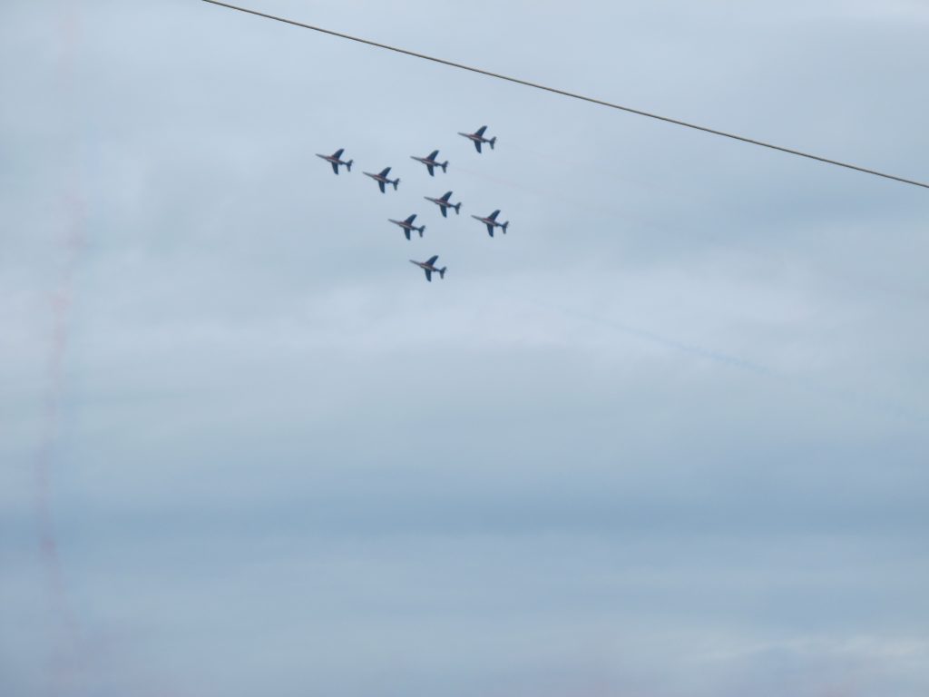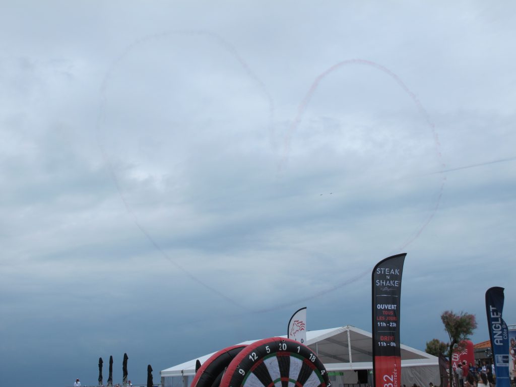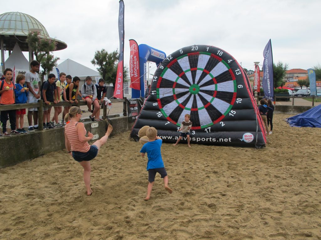 Zum Glück sind wir noch losgezogen, da am Strandzentrum ein großes Event stattfinden sollte: ein Strand-Rugby-Turnier. Dafür waren Büdchem am Strand aufgebaut und u.a. auch eine große, mit Luft gefüllte Dartscheibe, wo man mit Klettbällen und Klett-Fußbällen draufschießen konnte, was nat. den Jungs ganz großen Spaß gemacht hat. Zusätzlich kam vor dem Anpfiff auf einmal ein Jagdgeschwader angeflogen, bestehend aus 8 Flugzeugen (sahen etwas F16-mäßig aus…) und haben mit Farben akrobatische Tricks im Himmel gezeigt, das war schon ganz schön sensationell…